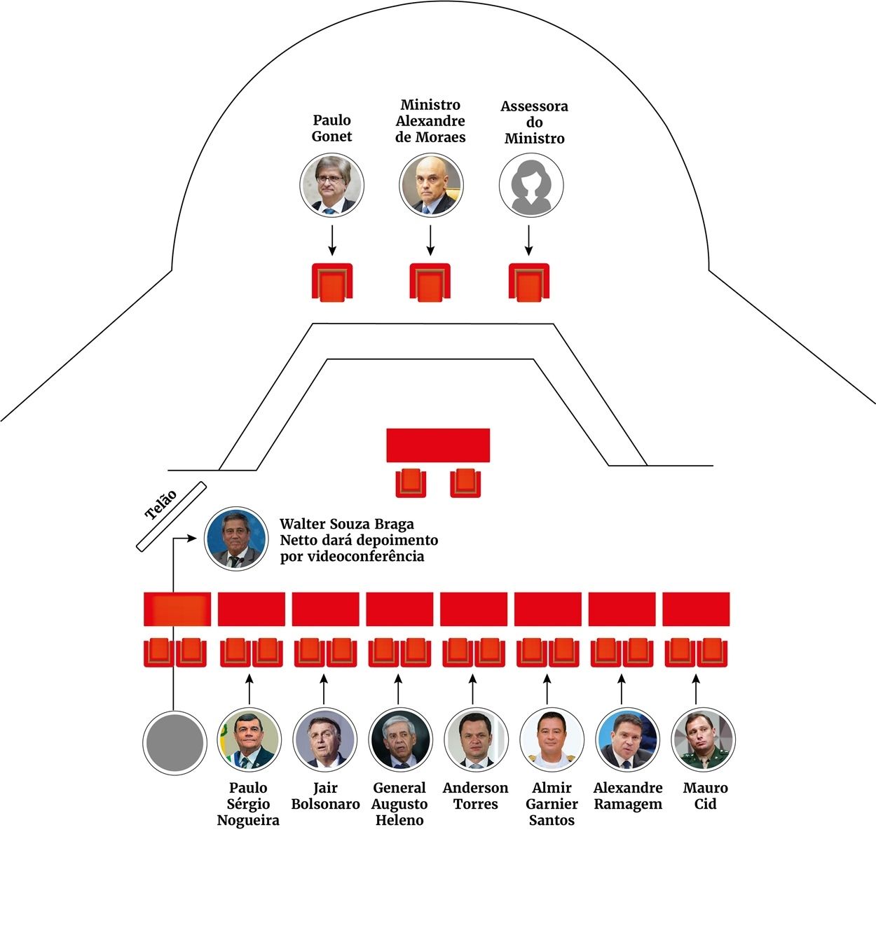 Cada um será chamado diante dos ministros da Primeira Turma, incluindo Alexandre de Moraes, pra prestar depoimento lado a lado com o advogado. A disposição na sala segue a ordem dos interrogatórios — e o clima, segundo fontes internas, é de tribunal do júri.