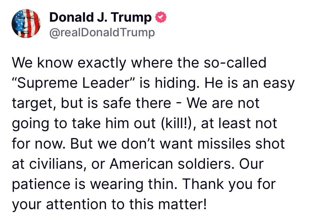 O presidente dos EUA disse que o líder supremo do Irã, Ali Khamenei, é um "alvo fácil" e que os americanos sabem “exatamente onde ele está escondido”. Mas, por ora, a prioridade é forçar uma rendição total de Teerã.
